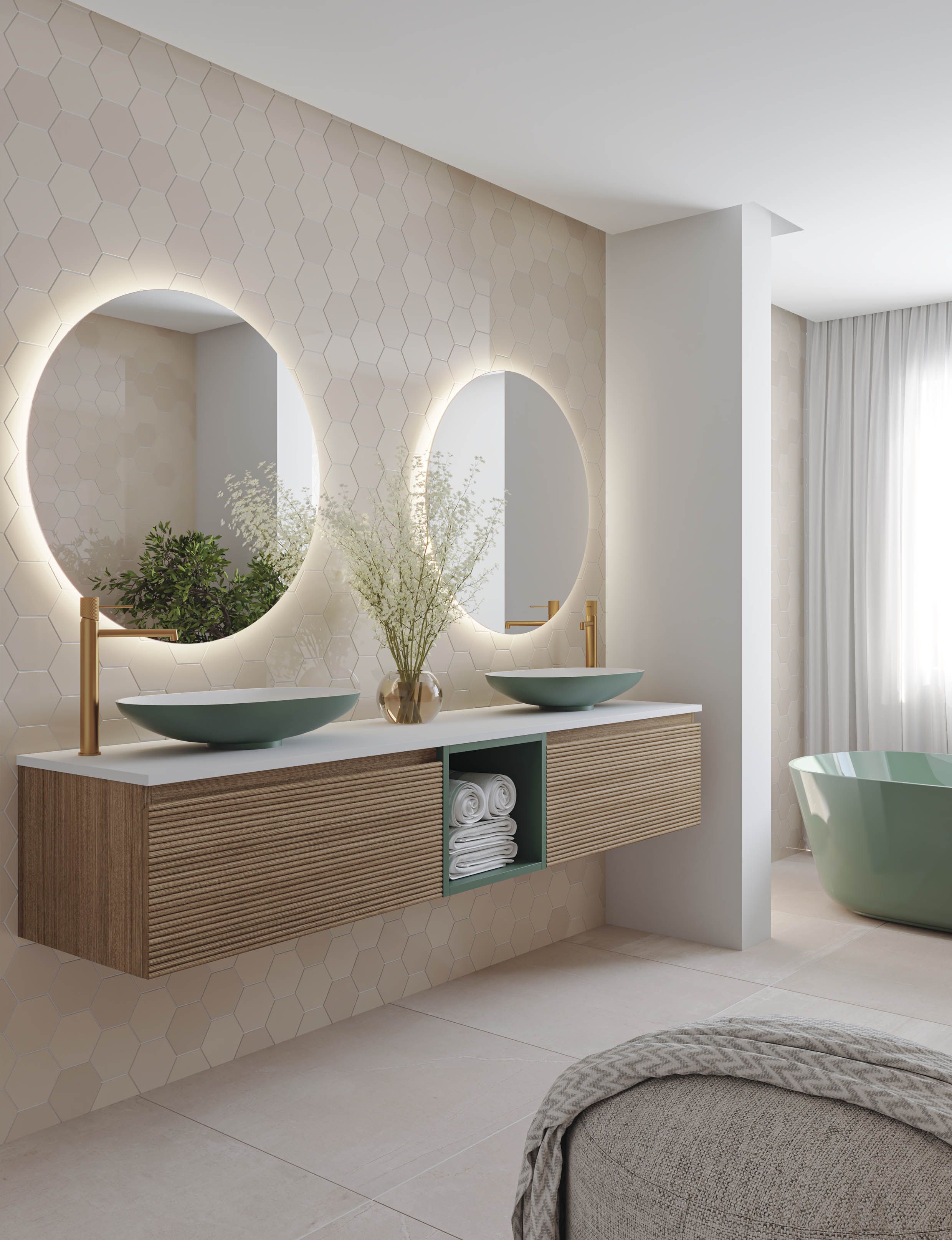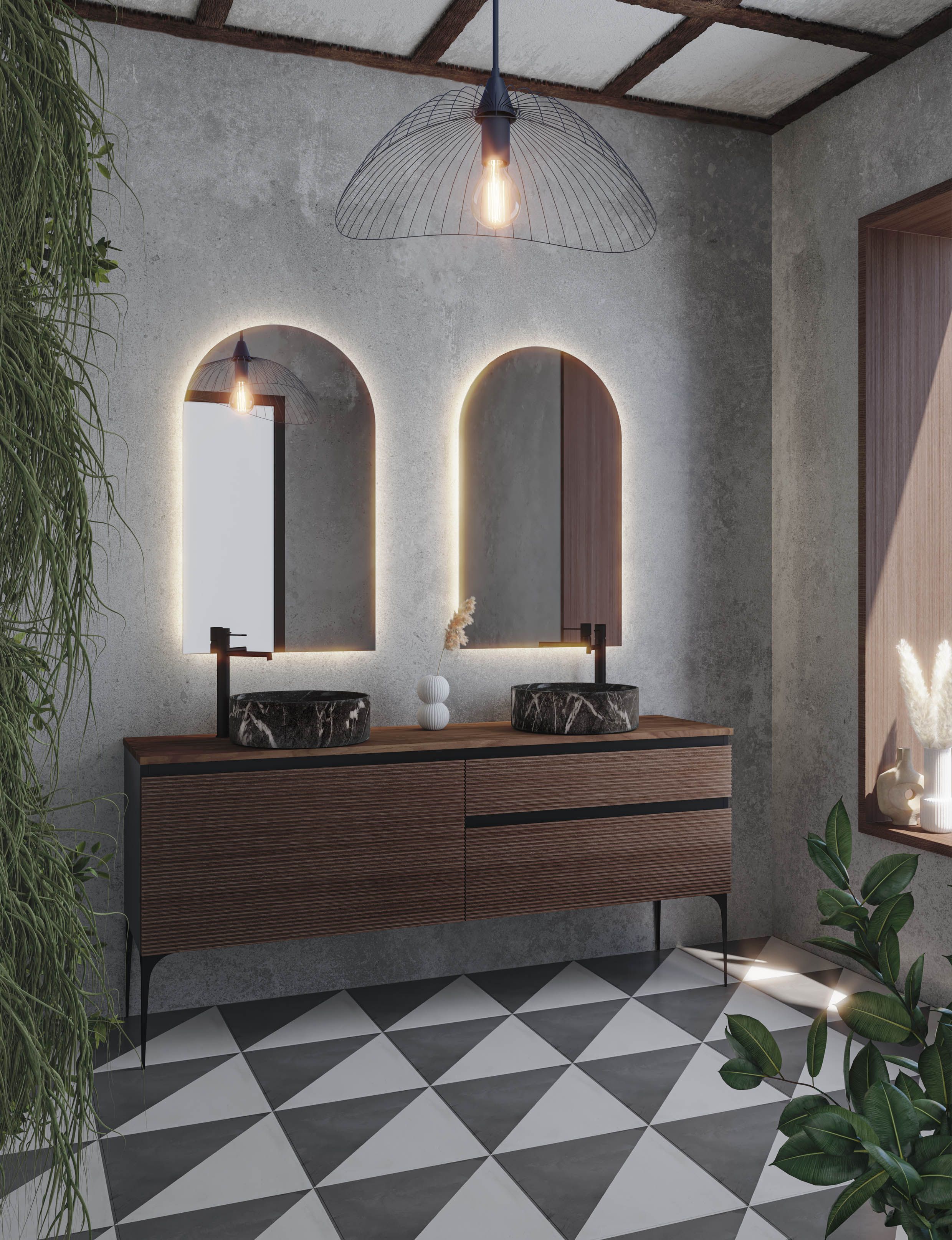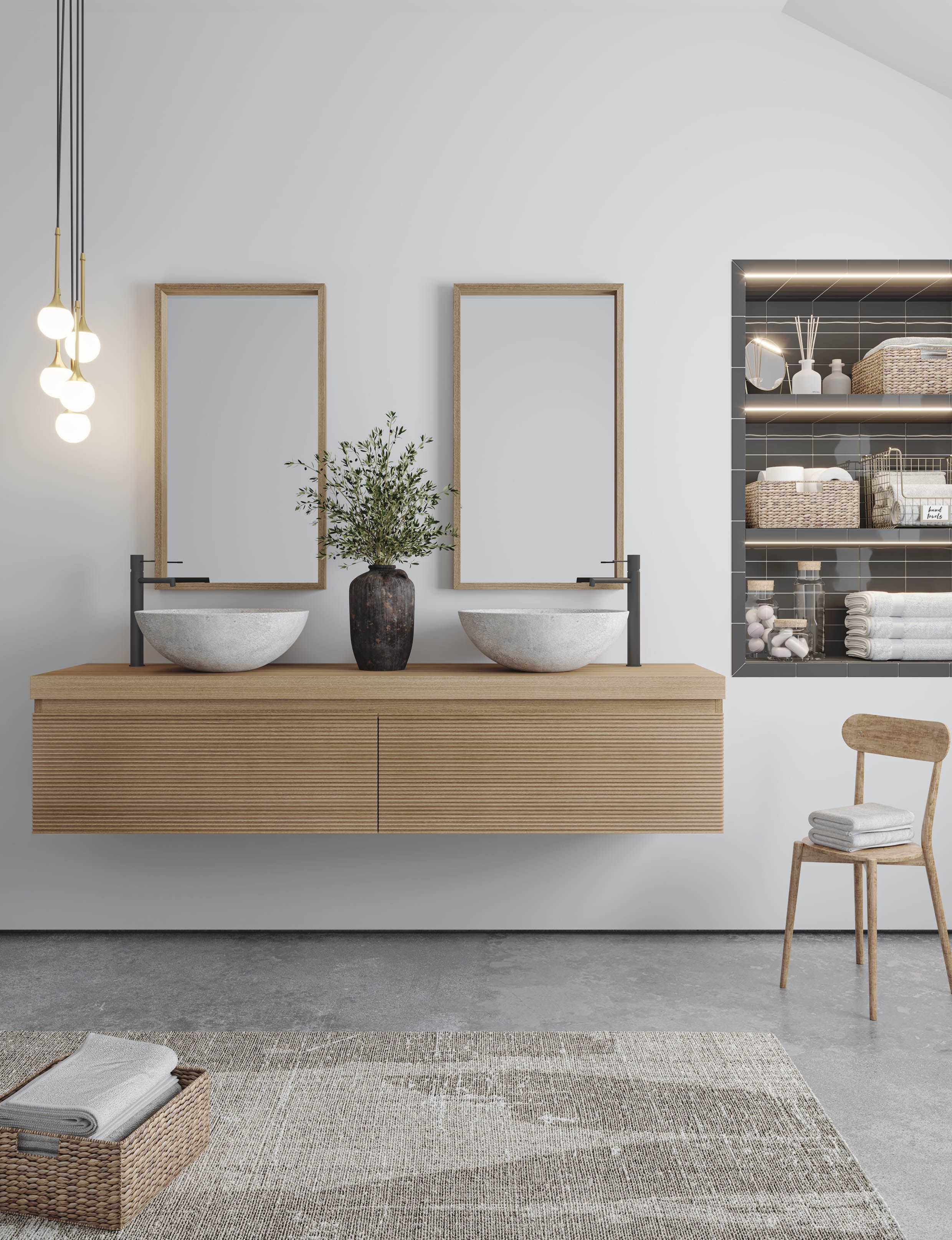 Serie con texturas de tendencia para una colección moderna que presenta una estética totalmente actual que se adaptará a todo tipo de propuestas decorativas para cuartos de baño, donde el mueble tendrá gran protagonismo estético.