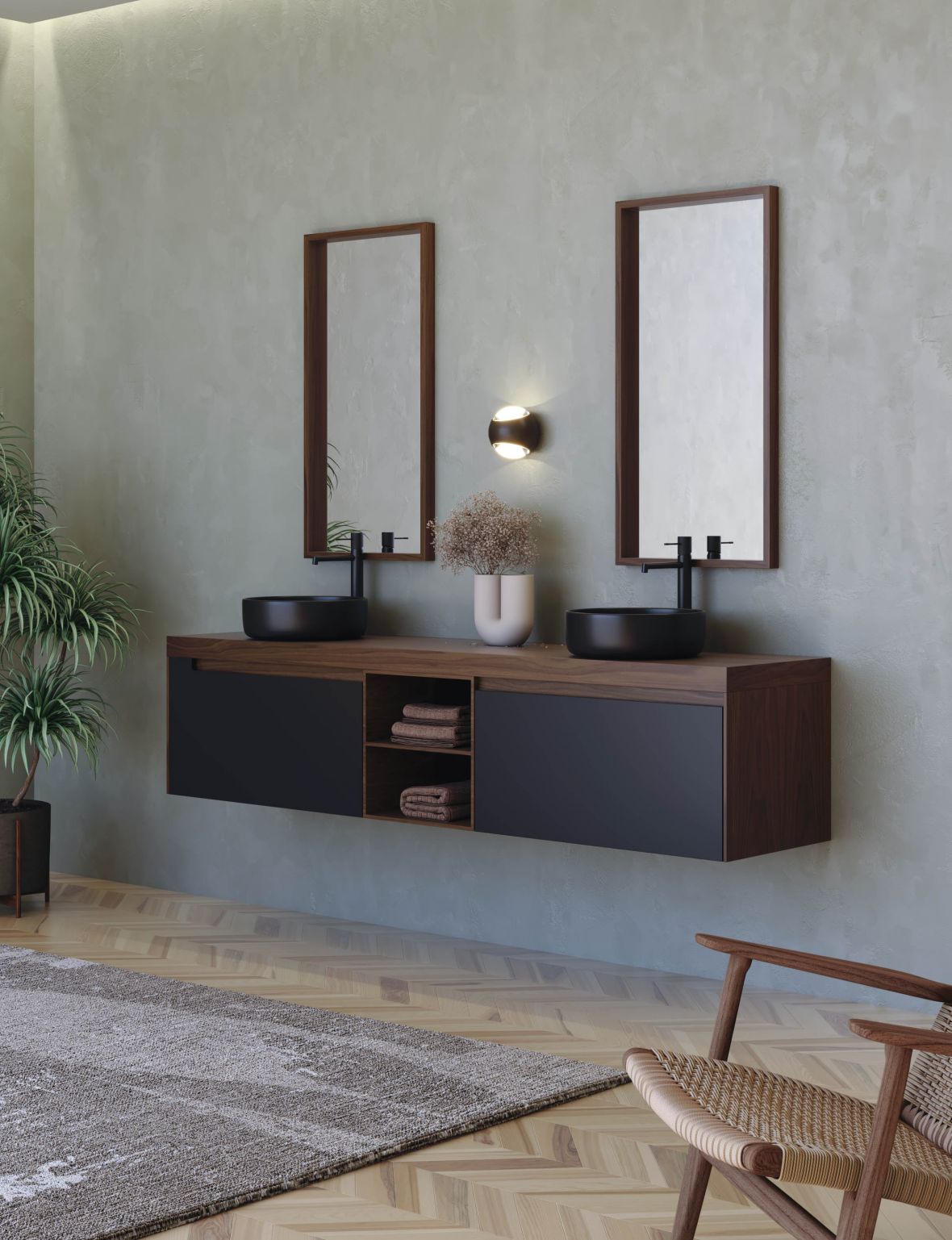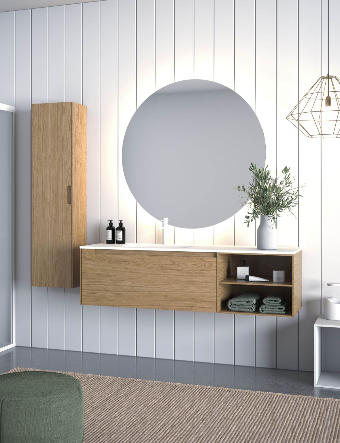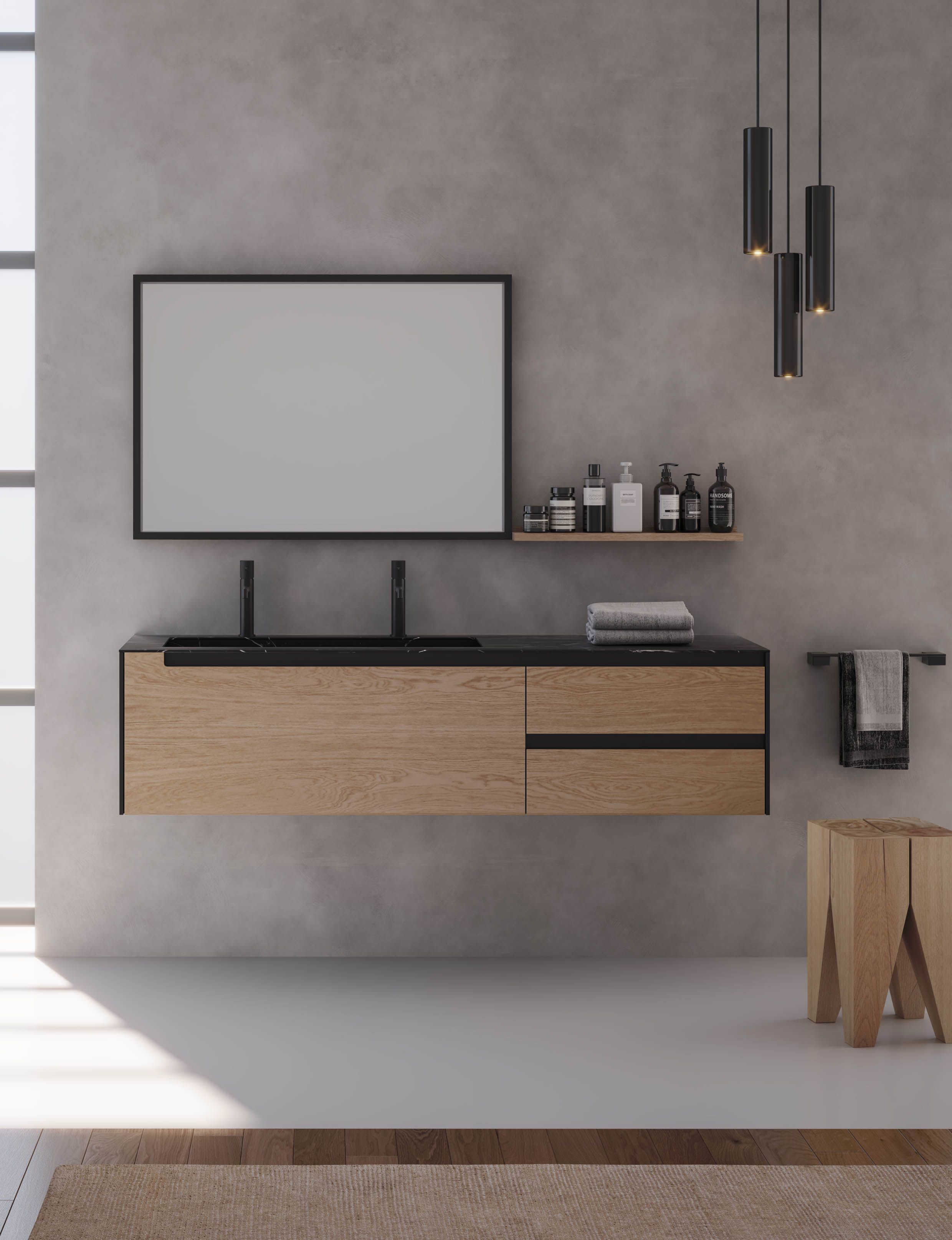 Con tonos lisos, tonalidades de madera o frentes de cajones estampados podrá elegir y configurar cualquier mueble de la serie NIZA